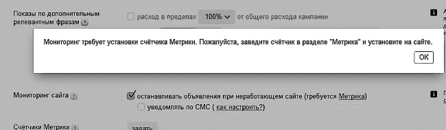 Мониторинг сайта. Как показала практика, этот параметр поможет существенно экономить рекламный бюджет. Бывают такие моменты, когда сайт не работает или недоступен, чего желательно не допускать хотя бы из-за задержки оплаты. Необходимо включить этот параметр, чтобы в это время впустую не показывалась реклама и не привела к нежелательным затратам. Правда, необходимо одно условие – на сайте должна быть установлена Яндекс Метрика.