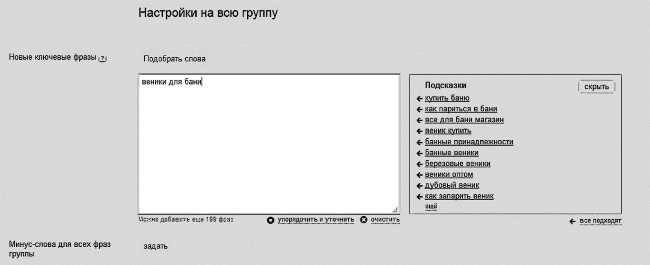 Я набрала в левом поле фразу веники для бани. В правом окошечке выпал список подсказок. При желании его можно расширить, если нажать на еще. Вот из этого списка и выбираем все, что посчитаем нужным.