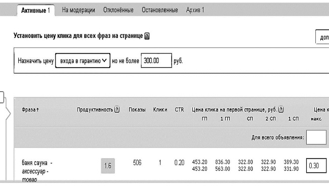 А вот цена гарантированного показа по липовым веникам уже один рубль. Но это не значит, что мое объявление никогда не покажут. Покажут. Но не так часто. Видите, на рисунке две последние колонки, это максимально допустимая цена, которую выставила я, и цена клика на поиске. Они совпали. Значит, объявление будут показывать, но не так часто.