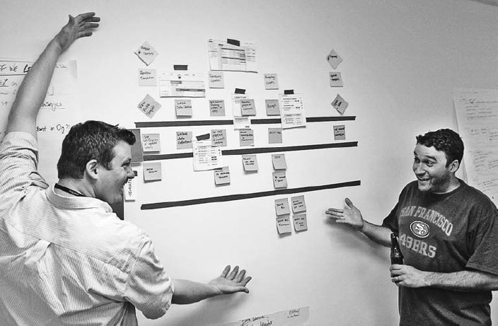 После нескольких итераций с простыми прототипами ребята наконец убедились, что у них есть нечто достойное реализации. Вам может показаться, что это заняло очень много времени, но на самом деле потребовалось около трех дней. Последним шагом стало создание бэклога и плана предъявления функциональности пользователям. План вы можете видеть на фотографии. Это очень хороший план, именно поэтому они так радуются.