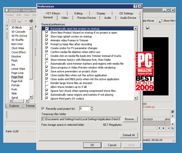 Именно к категории «почти профессиональных» можно отнести Vegas Movie Studio 9 компании Sony Creative Software, – этот пакет позволяет работать с картинкой в форматах вплоть до HD и звуком до Surround 5.1. В версии Platinum Pro Pack пакет имеет целый комплекс прикладного ПО, который позволяет самому неподготовленному пользователю организовать на своем компьютере небольшую киностудию. Помимо собственно видеоредактора с богатым функционалом наложения видеопотоков и цветокоррекции в комплект входят утилиты для формирования и записи DVD/Blu-Ray, для редактирования и создания музыкальных тем (в том числе и полностью авторских, пусть даже в отсутствие у пользователя изначальных познаний в музыкальной композиции), а также подробнейшее интерактивное руководство.
