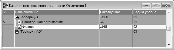 В данном окне представлен список введенных ранее центров финансовой ответственности (при первом открытии окна в нем не будет ни одной позиции). Этот список может иметь как иерархическое, так и линейное представление – для переключения режимов отображения предназначена команда Представление дерево-линейный список, находящаяся в вызываемом нажатием правой кнопки мыши контекстном меню (эту команду можно активизировать также с помощью комбинации клавиш Alt+S).