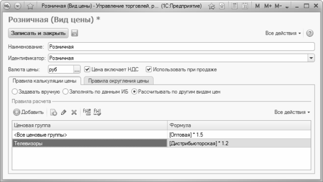 Если же для разных ценовых групп планируется использовать разные цены (например, для ценовой группы «Телевизоры» цена рассчитывается по одной формуле, а для ценовой группы «Телефоны» – по другой), то в инструментальной панели, которая находится над таблицей, нажмите кнопку Добавить или выполните команду Все действия ? Добавить. При этом в таблице появится новая позиция, для которой из раскрывающегося списка, содержимое которого формируется в справочнике ценовых групп, выбирается название группы цен, а затем для этой группы в соседней колонке нужно будет ввести формулу.