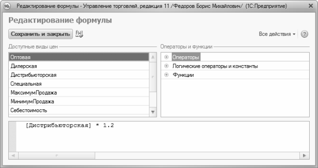 Использование конструктора предельно упрощает процесс создания формул. В левой верхней части находится перечень идентификаторов видов цен. Если в этом перечне дважды щелкнуть мышью на позиции, которая будет использоваться в качестве базовой для расчета цены, то название выбранного вида цен появится внизу окна, при этом оно будет заключено в квадратные скобки – в соответствии с требованиями синтаксиса языка «1С Предприятие».