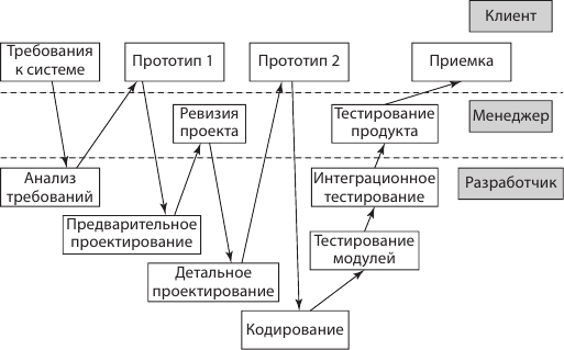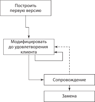 В предыдущей главе был рассмотрен ряд моделей, используемых в разработке ПО, в частности модель Build-and-fix (модель неполного жизненного цикла, рис. 3.1), которая в силу своей простоты не пригодна для больших и сложных проектов, имеющих размеры более 1000 программных строк. Также была рассмотрена модель быстрого прототипирования, которая тоже несколько ограниченна, несмотря на то что включает в себя все необходимые стадии жизненного цикла: анализ и спецификацию требований, первичное и детальное проектирование, реализацию, модульное и сборочное тестирование, интеграцию, тестирование продукта, передачу его заказчику, вывод из эксплуатации. Несмотря на это, она несамостоятельна, потому что на самом деле этап тестирования (и индивидуальных модулей, и при сборке) недостаточен, документация неполная, и продукт, получаемый на выходе, лишь моделирует функциональность той «боевой» системы, разработка которой ведется.