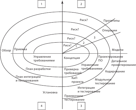 Рис. 3.8. Спиральная модель жизненного цикла ПО