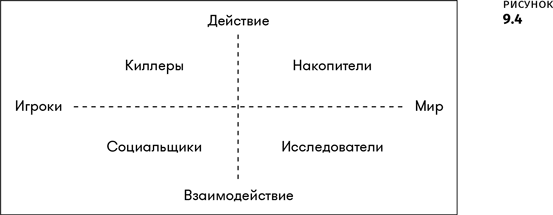 Бартл также предлагает любопытный график (рис. 9.4), демонстрирующий, как представители каждой из четырех групп соотносятся друг с другом: иными словами, накопители заинтересованы в действиях, направленных на окружающий мир, исследователи заинтересованы во взаимодействии с миром, социальщики заинтересованы во взаимодействии с игроками, а киллеры – в действиях, направленных на других игроков.