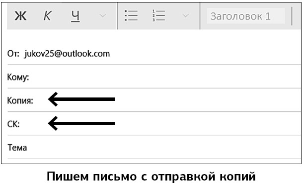 Внимание! Чтобы открылись поля копий, щелкните по значку копий в правом углу строчки Кому.