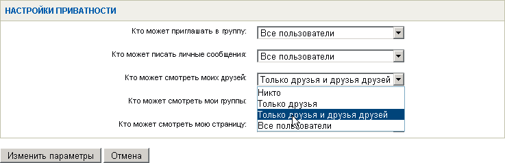 • «просматривать список друзей могут все пользователи» – включаем записи, опубликованные друзьями владельца ленты в блогах социальной сети;
