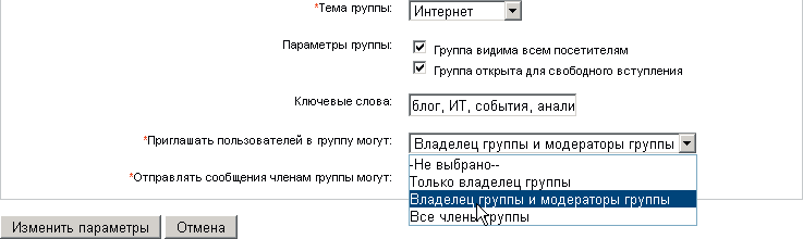 Параметр «группа видима всем посетителям» должен учитываться при включении записей блога группы в ленты ее участников. В настройках блогов нас интересует параметр «кто может просматривать сообщения». От него зависит, войдут ли записи блога в ленты участников группы, причем они будут включаться только, если просмотр будет разрешен всем пользователям.