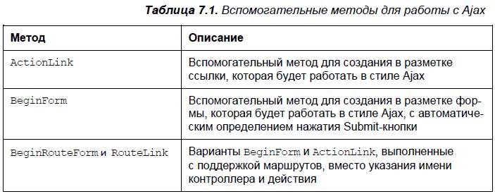 Для упрощения работы с Ajax MVC Framework содержит кроме JavaScript-файлов еще и расширения в виде классов и методов .NET. Так, класс viewPage, по умолчанию базовый для всех страниц MVC-проектов, содержит свойство Ajax, которое является экземпляром класса AjaxHelper.AjaxHelper содержит перечисленные в табл. 7.1 вспомогательные методы для работы с Ajax в представлениях.