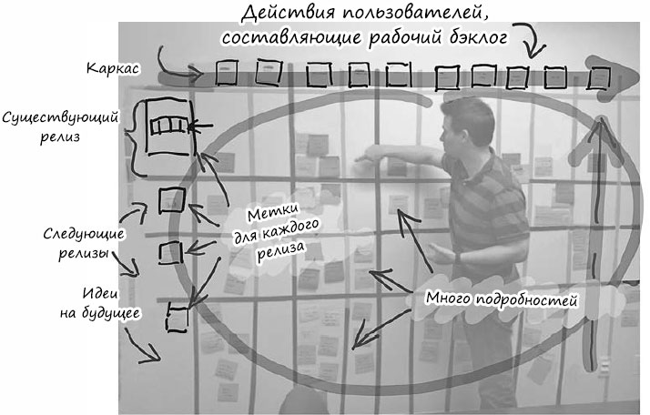 Бэклог Эрика был организован как карта историй с каркасом из желтых стикеров, расположенным наверху. На этих желтых стикерах в виде глагольных фраз были кратко обозначены действия пользователей с продуктом, которые формировали большую и связную высокоуровневую историю. Ниже располагались подробности – конкретные действия пользователей и то, что им нужно для реальной работы с продуктом. И если детали, над которыми работали Эрик и его команда, менялись от релиза к релизу, то каркас оставался неизменным.