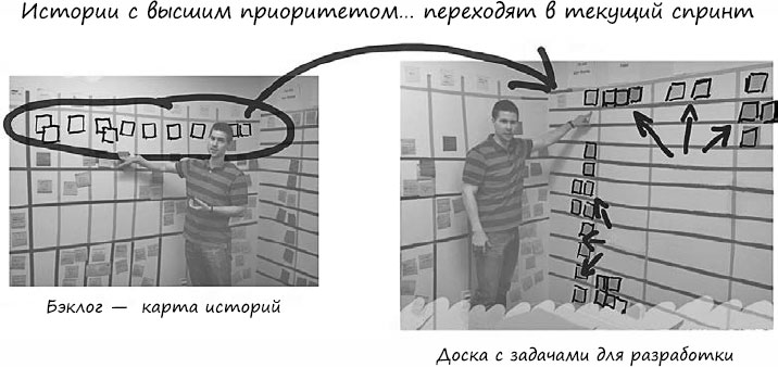 Если вы присмотритесь, то заметите, что верхняя часть текущего среза пуста – это я дорисовал контуры стикеров там, где они должны были быть. По мере того как члены команды совместно работали над планированием, они перемещали эти стикеры на доску с задачами по разработке, находящуюся справа от карты историй. Эта доска показывает истории, которые находятся в работе в текущем спринте, вместе с задачами по предъявлению, в рамках которых программисты и тестировщики обрабатывают различные технические детали, необходимые для успешного воплощения идей истории в работающее ПО.