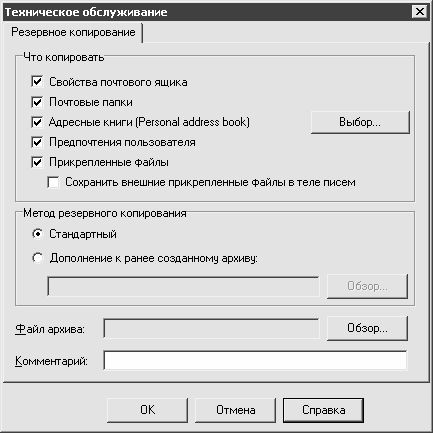 В выделенной области Что копировать путем установки соответствующих флажков определяются объекты копирования. Если установлен флажок Свойства почтового ящика, то в состав резервной копии будут включены свойства почтового ящика, определенные в окне редактирования его свойств (данное окно изображено на рис. 3.7). При установленном флажке Почтовые папки будут скопированы все имеющиеся почтовые папки, которые отображаются в панели папок.