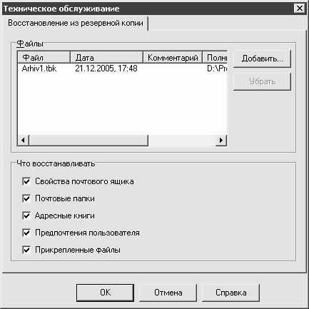 В выделенной области Что восстанавливать путем установки соответствующих флажков выбираются объекты восстановления. Здесь содержатся те же флажки, что и в окне создания резервной копии в выделенной области Что копировать (см. рис. 3.17 и 3.18), за исключением флажка Сохранить внешние прикрепленные файлы в теле писем.