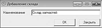 В данном окне нужно с клавиатуры ввести произвольное название склада и нажать кнопку ОК.