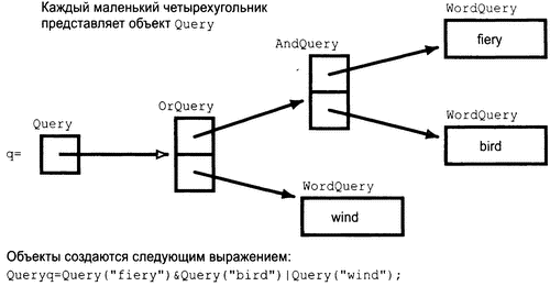 Как только создано дерево объектов, обработка (или отображение) данного запроса сводится к простому процессу (осуществляемому компилятором), который, следуя по линиям, опрашивает каждый объект дерева, чтобы выполнить (или отобразить) необходимые действия. Например, если происходит вызов функции eval() объекта q (т.е. корневого класса дерева), функция eval() опросит объект класса OrQuery, на который он указывает. Обработка этого объекта класса OrQuery приведет к вызову функции eval() для двух его операндов, что, в свою очередь, приведет к вызову функции eval() для объектов классов AndQuery и WordQuery, которые осуществляют поиск слова wind. Обработка объекта класса AndQuery, в свою очередь, приведет к обработке двух его объектов класса WordQuery, создав результаты для слов fiery и bird соответственно.