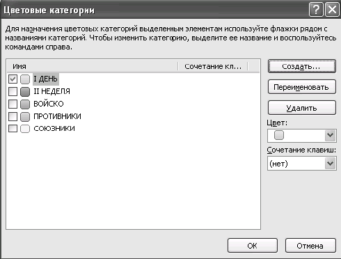 (В Outlook 2003 категории не имеют своего цвета; чтобы выделить встречу как бюджетируемую, нужно выбрать зеленую метку в поле «Метка» в окне создания встречи. Как это делать, было показано в главе 1.)