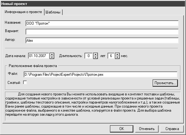Поле Файл можно заполнить с клавиатуры, но удобнее это делать с помощью кнопки Пролистать. При нажатии этой кнопки на экране открывается окно, в котором по обычным правилам Windows-приложений нужно указать путь к файлу и его имя. Файлы проектов в программе Project Expert имеют расширение *.рех. По умолчанию программа предлагает сохранить файл проекта в папке Projects, которая находится в каталоге программы.