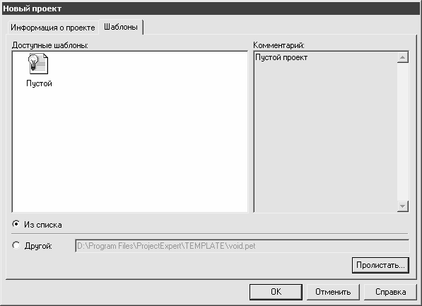 В первом случае установите переключатель, расположенный внизу окна, в положение Из списка, затем в расположенном выше поле Доступные шаблоны щелчком мыши укажите требуемый шаблон и нажмите кнопку ОК.