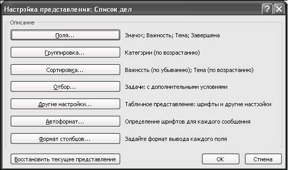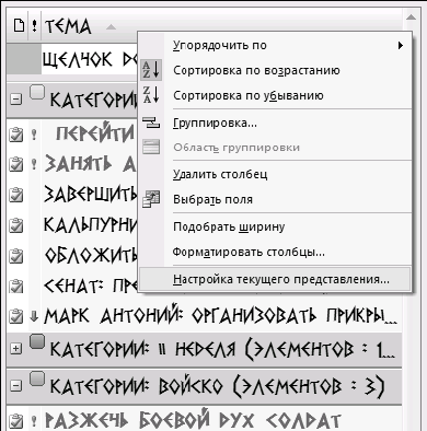 Сейчас мы научимся использовать самую, пожалуй, «вкусную» возможность Outlook – настройку пользовательских представлений. Пользовательское представление – это некий взгляд на ваш список задач, возможность представить их именно так, как хотите вы, пользователь. Первое, что мы сделаем в пользовательском представлении нашей панели задач, – сгруппируем задачи по категориям, т.е. удобным нам контекстам.