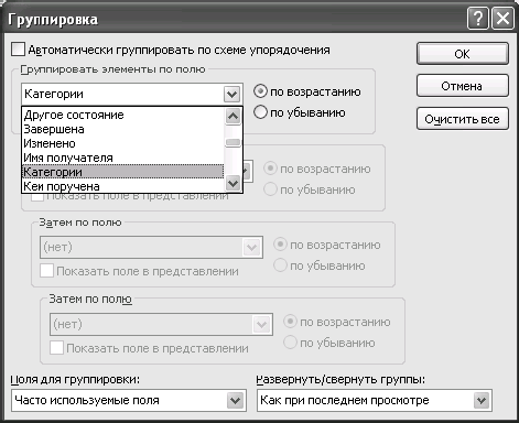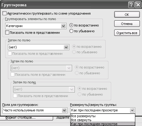 3. Появится окно «Группировка». В подменю «Группировать элементы по полю» выберите «Категории».