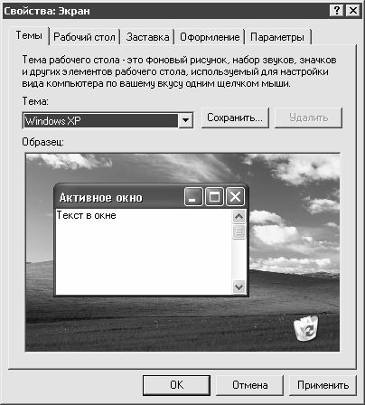 Выбор требуемой темы осуществляется из раскрывающегося списка в поле Тема. Изначально в состав Windows XP Professional входят две темы: Windows XP (она установлена по умолчанию) и Классическая (эту тему следует выбрать в том случае, когда необходимо вернуться к классическому оформлению, использовавшемуся в предыдущих версиях Windows). Также можно использовать любую другую тему – для этого необходимо выбрать в раскрывающемся списке значение Обзор, и в открывшемся окне Открыть тему указать путь к файлу требуемой темы (файл темы имеет расширение.*Theme).