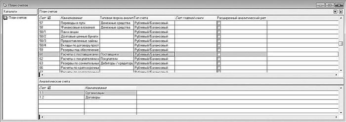 В верхней части данного окна представлен список счетов бухгалтерского учета. Для каждого из них в соответствующих колонках отображаются данные, достаточные для идентификации (уникальный числовой идентификатор, наименование, типовая форма аналитики и др.). В нижней части окна показан перечень аналитических разрезов для того счета, на котором в верхнем списке установлен курсор (на рис. 6.14 это счет 60 «Расчеты с поставщиками и подрядчиками»).