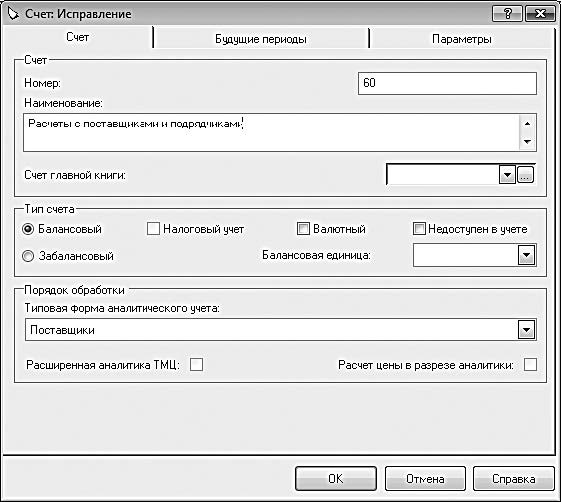 Если по счету предполагается ведение учета в разрезе аналитики, то в соответствующем поле нужно из раскрывающегося списка выбрать типовую форму аналитического учета. Например, для счета 60 «Расчеты с поставщиками и подрядчиками» в данном поле логично выбрать значение Поставщики (см. рис. 6.15). Для счетов по учету товарноматериальных ценностей, у которых в поле Типовая форма аналитического учета выбрано соответствующее значение, становится доступным флажок Расширенная аналитика ТМЦ. При его установке включается механизм ведения расширенной аналитики по данному счету, а также появляется возможность расчета цен в разрезе аналитики.