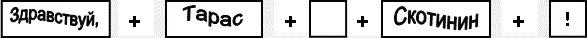 Далее, после ввода данных, надо напечатать в одной строке несколько параметров: приветствие, имя, фамилию, и восклицательный знак в конце, чтобы обратиться к Тарасу Скотинину так: