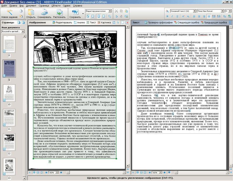 О технологической начинке FineReader 10 отдельно говорить не имеет смысла – об этом шла речь в рецензии на ABBYY PDF Transformer (см. на нашем сайте). В программе используется второе поколение адаптивной технологии распознавания документов ADRT Adaptive Document Recognition Technology. Поэтому программа «видит» документ как единое целое, более точно распознаются номера страниц, сноски, нижние и верхние колонтитулы, подписи к картинкам, стили шрифтов и заголовков, оглавления и разноуровневые названия. Тем не менее все те недостатки, которые мы заметили в PDFT 3.0, имеются и здесь.