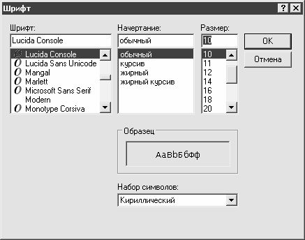 Текстовый редактор Блокнот также имеет широкое распространение. Возможность изменения масштаба в нем не предусмотрена, однако при необходимости можно просто изменить размер шрифта, которым отображается текущий документ. Для перехода в режим настройки шрифта следует выполнить команду главного меню Формат?Шрифт – в результате на экране откроется окно, изображенное на рис. 2.4.