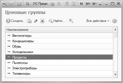 Смысл данной операции заключается в следующем. Предположим, что товары группы «Холодильники» предприятие намерено реализовывать по мелкооптовым ценам, а товары группы «Стиральные машины» – по крупнооптовым. В такой ситуации при создании соответствующих документов программа автоматически может назначать мелкооптовые цены товарам группы «Холодильники», и крупнооптовые – товарам группы «Стиральные машины». Данные об использовании на торговом предприятии ценовых групп используются при формировании правил расчета цен товаров (описание данного режима приводится ниже), которые относятся к разным ценовым группам.