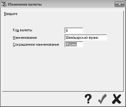 Переход в режим ввода новой валюты осуществляется нажатием кнопки Добавить; для редактирования имеющейся валюты следует нажать кнопку Изменить (для перехода в данные режимы можно также воспользоваться соответствующими командами контекстного меню). Окно ввода и редактирования валюты показано на рис. 1.7.