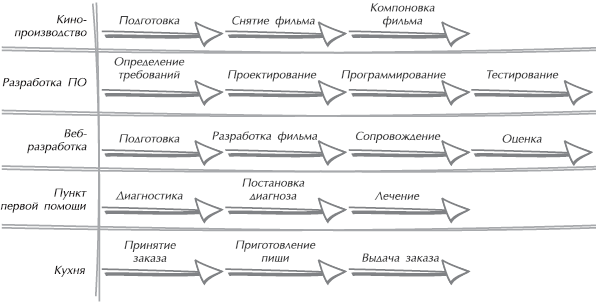 Рис. 1.1. Теоретически во многих отраслях протекают схожие рабочие процессы. Всегда отводится время на планирование, выполнение и доработку (тем не менее не следует обращаться за медицинской помощью на кухню и требовать обед в пункте первой медицинской помощи)