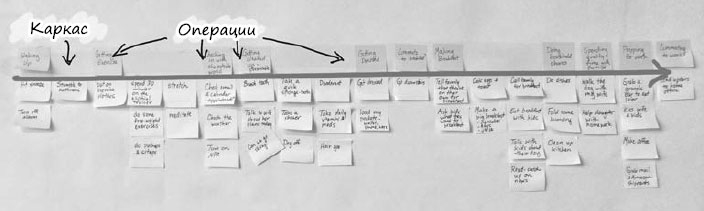 Стикеры, где записаны более высокоуровневые задачи, представляют на карте операции. Операции составлены из набора задач, которые похожие люди выполняют примерно в одно и то же время, чтобы достичь определенной цели. Если вы прочтете список операций, расположенный вдоль карты, то тоже получите хронику повествования. Строка с этими наклейками представляет собой каркас карты. Если у вас есть карта с множеством стикеров и вы хотите с кем-то ею поделиться, лучше всего для начала изложить высокоуровневую историю. Просто прочитайте каркас карты, вставляя связку «а потом они…» между соседними операциями.