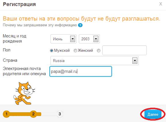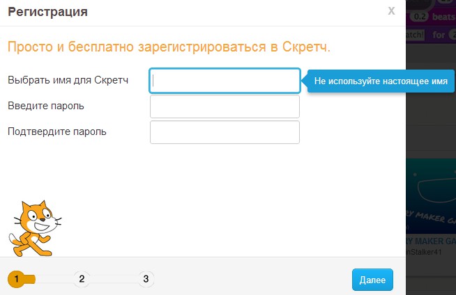 Откроется окно регистрации, в котором в верхнее окно надо ввести Ваше имя для сайта Scratch (иногда это имя называют «логин»). Разработчики советуют не вводить настоящее имя, я тоже не советую.