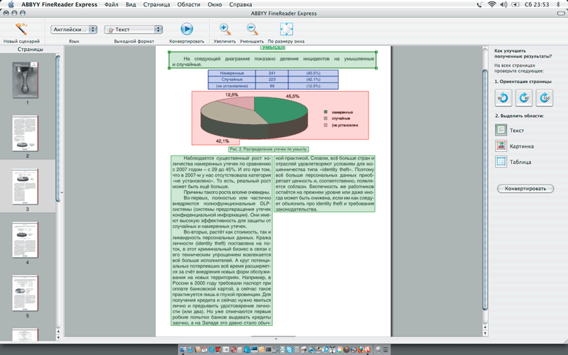 Работа с системой по сути сводится к выполнению наборов типовых сценариев. Автоматика со своими задачами обычно справляется, но порой приходится вмешиваться человеку, поскольку FineReader (кстати, вне зависимости от платформы) не всегда верно определяет тип некоторых блоков (например, снимков экранов в компьютерной литературе – они воспринимаются как текст или таблицы). Не всегда оптимально распознаются формулы, графики и диаграммы (впрочем, в других OCR-системах дело с этим обстоит не лучше). Следует также иметь в виду, что общее количество активных языков ограничено тремя, чего, как правило, вполне достаточно. Сочетание языков может быть совершенно произвольным, и это заметное преимущество перед пакетом ReadIRIS, главным конкурентом FineReader Express на платформе Mac (в ReadIRIS предусмотрены только англо-русская и англо-греческая пары).