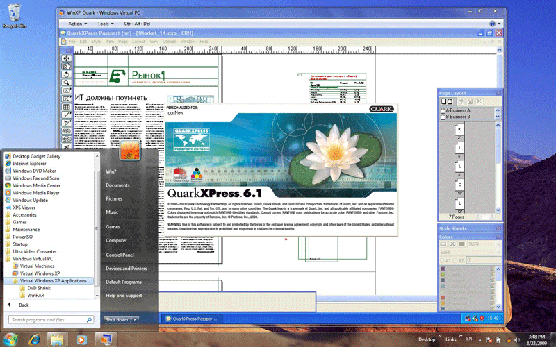 Подсистема виртуализации XP Mode предоставляет возможность безболезненно перейти на Windows 7 (на фото – тестовая инсталляция QuarkXPress в окне XP Mode).
