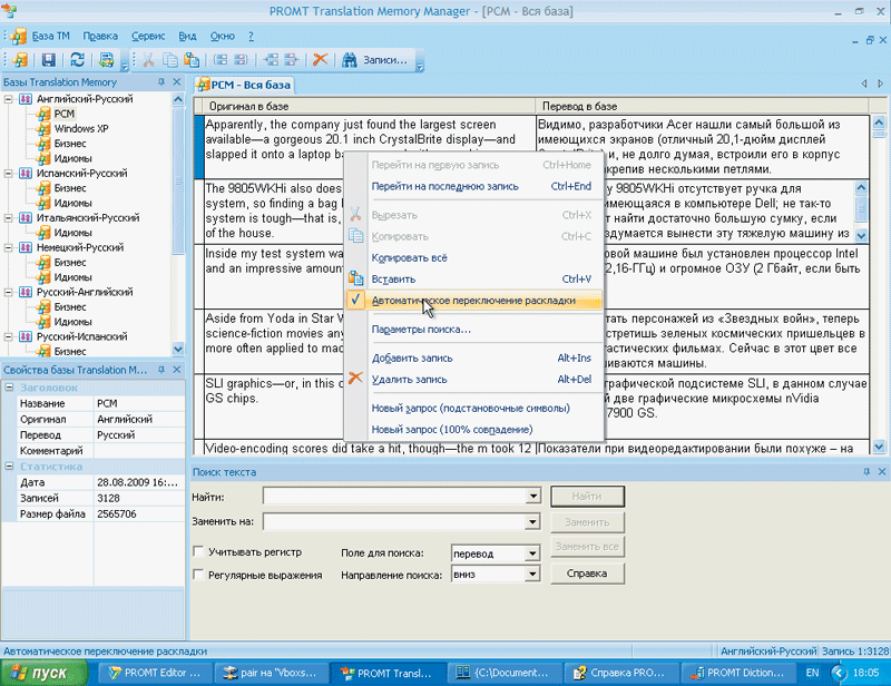 Система стала ощутимо быстрее, особенно это заметно при редактировании словарей и добавлении в пользовательский словарь оборотов со сложным управлением. Хотелось бы отметить явное ускорение обработки документов, если подключены объемные базы «памяти перевода» (Translation Memory, TM). У нас имеется собственная БД такого рода, в ней содержатся парные переводы из статей журнала за несколько лет. База данных довольно объемная (порядка шести тысяч пар «оригинал – перевод»), причем для весьма длинных предложений. Это становилось причиной снижения скорости перевода при активации процедуры нечеткого поиска (т. е. снижении порога точности совпадения фраз из Translation Memory до величины менее 100 %).