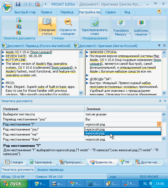 Последнее обстоятельство особенно важно. Качество переведенного текста напрямую зависит от гибкости и возможностей настройки пакета в соответствии с тематикой конкретного текста, от того, какими возможностями для распознавания специфичных языковых конструкций, идиом, речевых оборотов и их синтеза на другом языке система наделена разработчиком. Скажем, вполне типичный для американского английского (часто встречается в обзорах американского PC Magazine) пример: «Also, the 537s only comes with a 250W compact power supply unit». Казалось бы, его очень просто перевести на русский – но это просто для человека. При автоматическом переводе требуется учитывать контекст, тематику, терминологию и многое другое, у переводчика-человека это, как говорится, «сидит в подкорке». И именно развитые возможности настройки делают систему перевода PROMT уникальным программным продуктом.