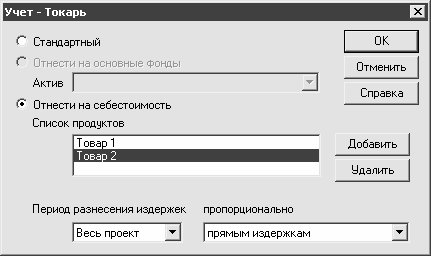 В данном окне с помощью переключателя можно выбрать один из следующих вариантов учета: Стандартный (этот вариант предлагается программой по умолчанию) и Отнести на себестоимость. В первом случае учет заработной платы будет вестись стандартным образом, в соответствии с другими настройками проекта. Во втором случае можно настроить перечисленные ниже параметры учета.