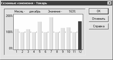 Вы можете предусмотреть сезонные колебания в выплате заработной платы. Это бывает актуально, например, для деятельности, которая носит ярко выраженный сезонный характер. Для этого предназначен параметр Сезонные изменения, расположенный внизу окна План персонала (рис. 4.51). После установки флажка становится доступной кнопка Сезонные изменения, при нажатии на которой на экране открывается окно, изображенное на рис. 4.54.