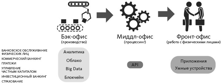 Финтех 2.0 разлагает финансовые структуры на их первоэлементы. Одни из них относятся к бэк-офису, другие – к миддл-офису, третьи – к фронт-офису, причем каждая область неплохо функционирует благодаря современным технологиям. Умные решения, начиненные искусственным интеллектом, интегрируемые через приложения, обеспечивают клиенту исключительно удобное взаимодействие с фронт-офисом. API и автоматически конфигурируемые интерфейсы миддл-офиса гарантируют связь между фронт- и бэк-офисом в режиме реального времени, а машинное обучение, искусственный интеллект, глубокий анализ данных и облачные технологии вместе с распределенными реестрами блокчейна помогают по-новому структурировать услуги на уровне бэк-офиса.