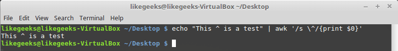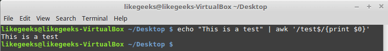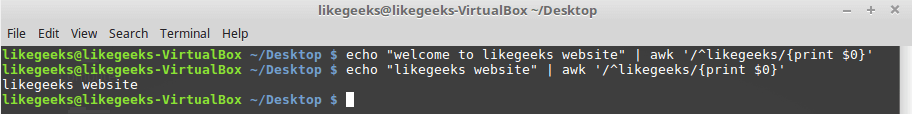 $ echo "welcome to likegeeks website" | awk '/^likegeeks/{print $0}'