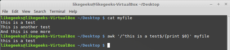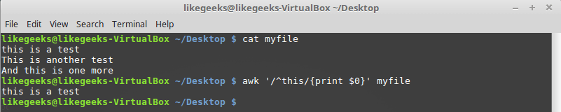 $ echo "likegeeks website" | awk '/^likegeeks/{print $0}'