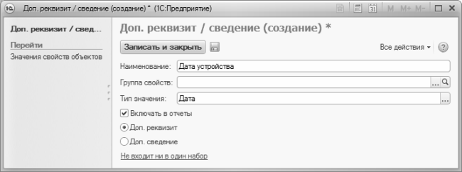Если вы хотите, чтобы свойство учитывалось при формировании отчетов, установите флажок Включать в отчеты (см. рис. 4.22). После этого с помощью переключателя укажите вид свойства – Доп. реквизит или Доп. сведение. Для сохранения введенных данных нажмите кнопку Записать и закрыть.