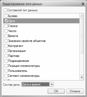 Для некоторых типов значений можно указать дополнительную информацию. Например, для типа значения Дата в нижней части окна появляется поле Состав даты (см. рис. 4.23), в котором из раскрывающегося списка можно выбрать формат даты: Дата, Время или Дата и время.