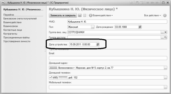 На рис. 4.24 показано окно редактирования объекта справочника физических лиц, в котором добавлен дополнительный реквизит Дата устройства (см. рис. 4.22 и 4.23).