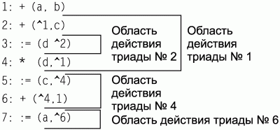 Область действия каждой триады можно легко определить, если просматривать список триад с конца: тогда первая же встреченная ссылка на триаду будет максимальной границей ее области действия, а номер триады будет определять минимальную границу ее области действия.